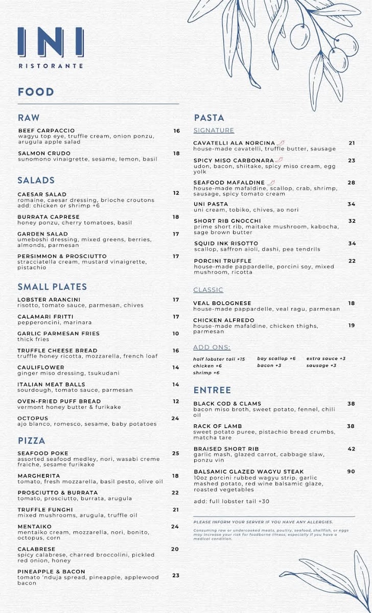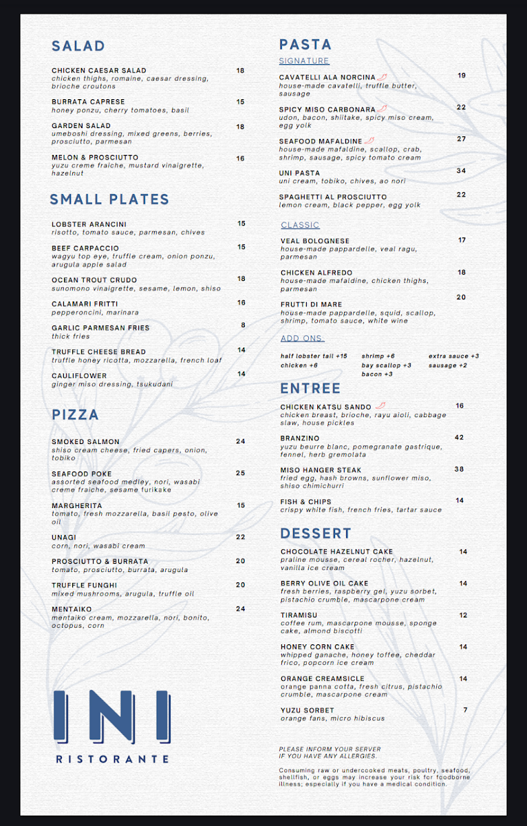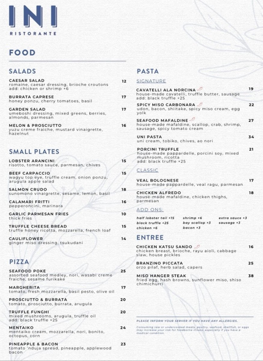 Welcome to INI Ristorante, a remarkable fusion restaurant nestled in the heart of Fountain Valley, California. Here, the culinary arts intersect in a delightful blend of Japanese and Italian cuisines, representing the vision of Kei Concepts. This establishment offers a unique dining experience, combining bold flavors and beautiful presentations, all set in an inviting atmosphere.