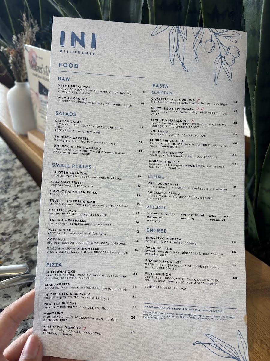 For those dining during lunch, indulge in the well-priced Lunch Menu, with offerings such as flavorful entrées for just $55 on weekdays. The Dinner Menu is equally tantalizing, featuring exquisite options for $65 on Monday through Friday. Additionally, families can rejoice with affordable kids’ meals, ensuring that INI Ristorante is a delightful experience for diners of all ages.
